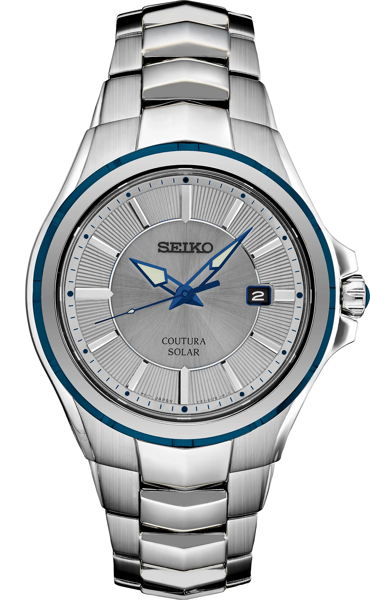 From the Coutura Collection. Delivering the Seiko Watches perfect blend of sport and style for those on the move, Coutura is crafted for effortless timekeeping excellence. The newest designs offer fresh color variations with pops of contrast and an emphasis on modern luxury. Included is this sophisticated timepiece anchored by a gray dial with blue accents, date calendar and LumiBrite hands and markers, plus a bezel with blue ion finish. Crafted of stainless steel, with vigorously SNE565 angular lines, this versatile watch includes a screwdown caseback, sapphire crystal and cabochon crown. Powered by any light source, with no battery change required, the energy-efficient solar cell provides a 10-month power reserve when fully charged. 10 bar, 100M Water Resistant
