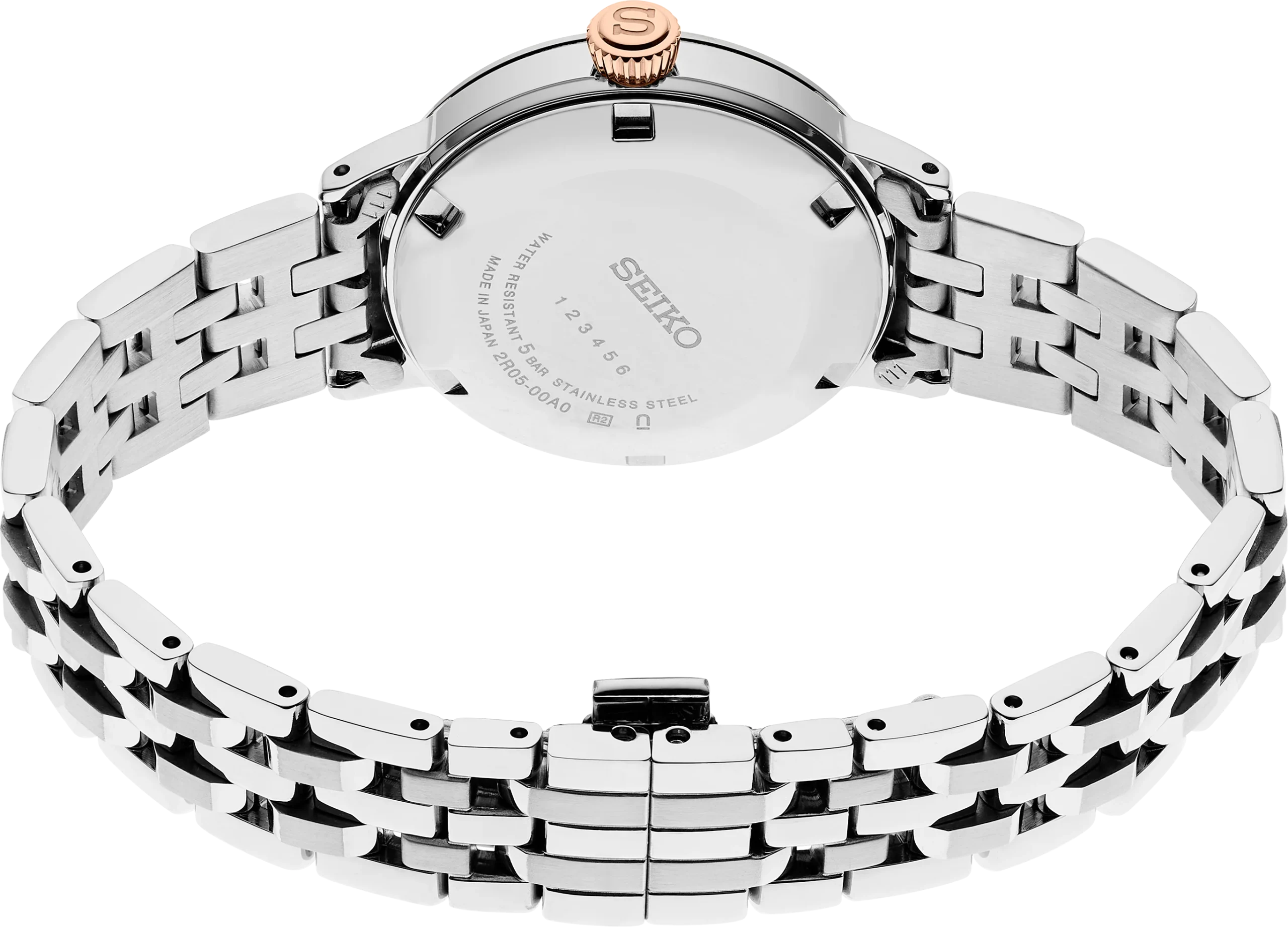 Seiko Presage Cocktail Time.  SRE009 Offering the finest in Japanese mechanical watchmaking, the Presage Collection blends precision technology with superior craftsmanship and design. Inspired by the vibrance of the city’s modern lounges, the newest Cocktail Time designs express the excitement of today’s Tokyo, with fresh styling and colors. With 8 diamonds adding sparkle to a white dial with pressed pattern, gloss finish, and rose gold accents, this exquisite timepiece evokes the Clover Club cocktail. Sleek and elegant, the gracefully slender case houses the new, thinner caliber 21-jewel automatic mechanical 2R05 movement, which beats at a frequency of 21,600 vibrations per hour, with a power reserve of approximately 41 hours and manual winding capability. The beautifully tapered five-row bracelet features a mirror finish for additional brilliance. Crafted of stainless steel, with date calendar, box-shaped crystal, screwdown caseback, and deployment clasp with push button release. 5 bar, 50M Water Resistant