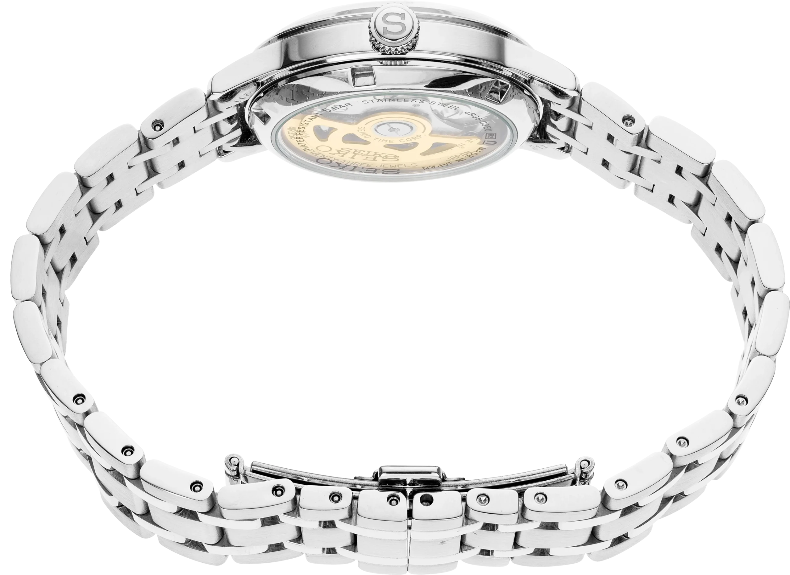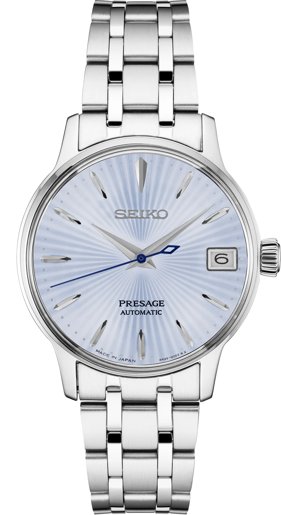 From the Presage Cocktail Time Collection. SRP841 Offering the finest in Japanese mechanical watchmaking, the Presage Collection blends precision technology with superior craftsmanship and design. Inspired by the delights of a cocktail bar, this sophisticated watch features an ice blue dial with pressed pattern, gloss finish and date calendar. The 23-jewel movement, with manual and automatic winding capability, beats at a frequency of 21,600 vibrations per hour, with a power reserve of approximately 41 hours. Crafted of stainless steel, this elegant timepiece includes a box-shaped crystal, screwdown see-through caseback, and double deployment clasp with push button release. 5 bar, 50M Water Resistant