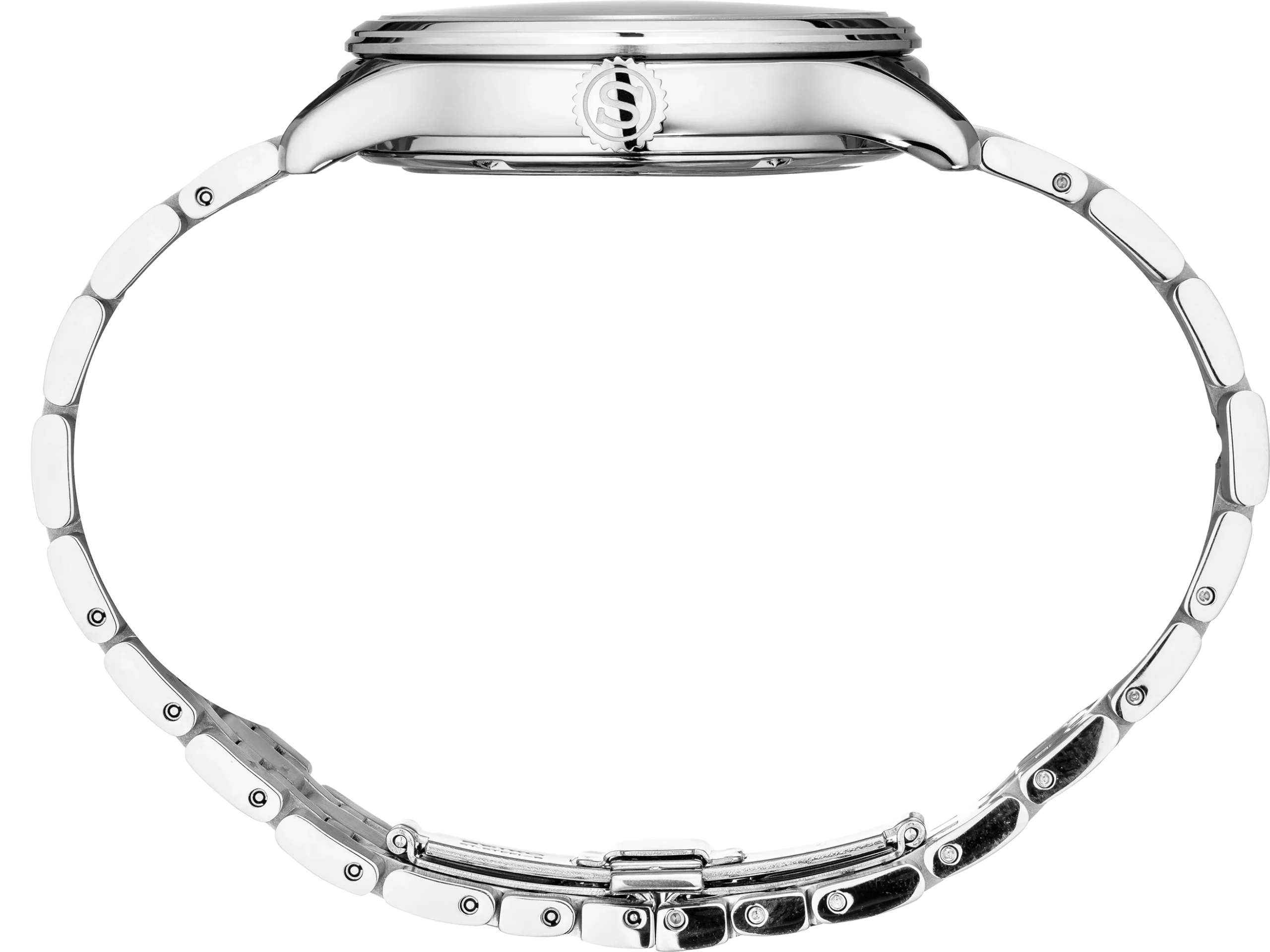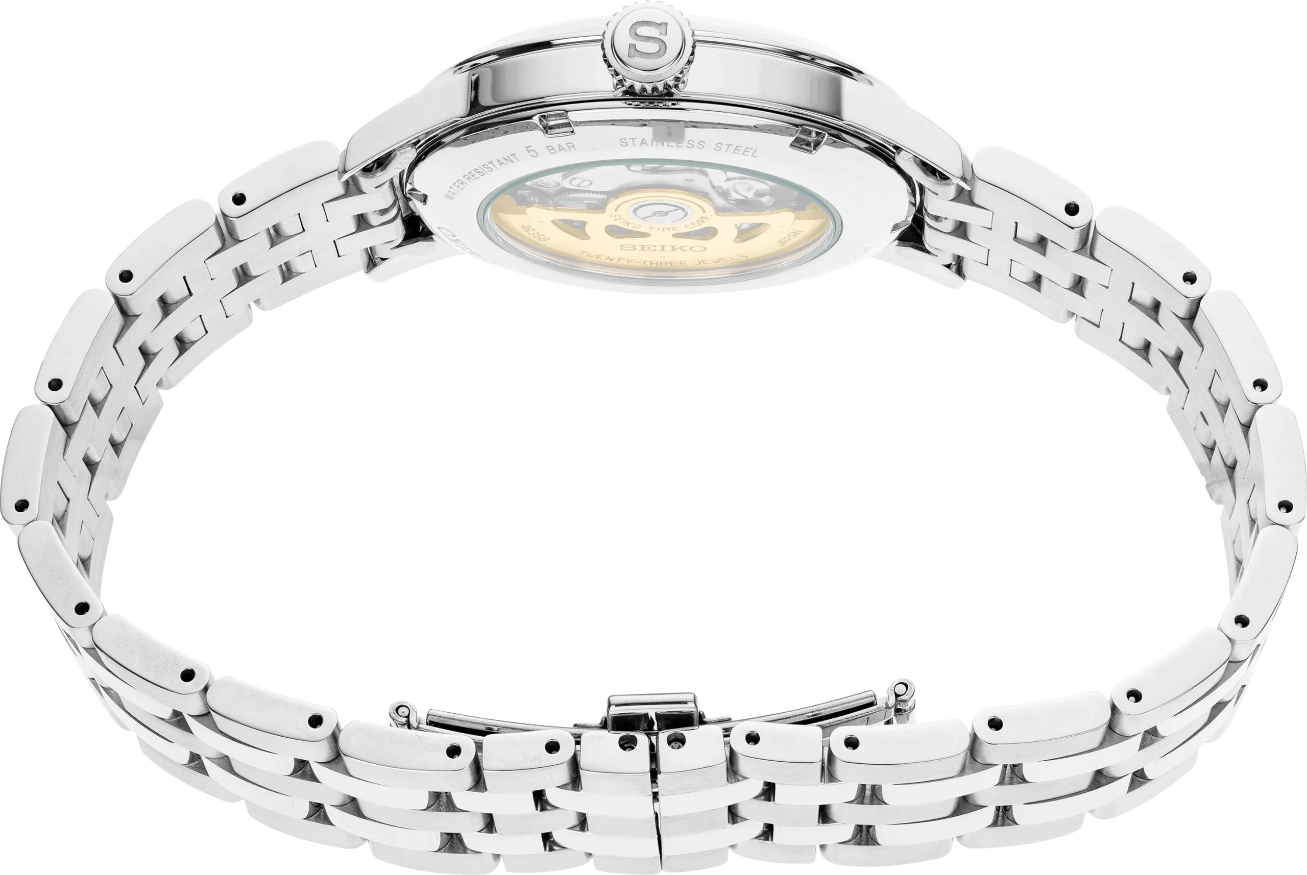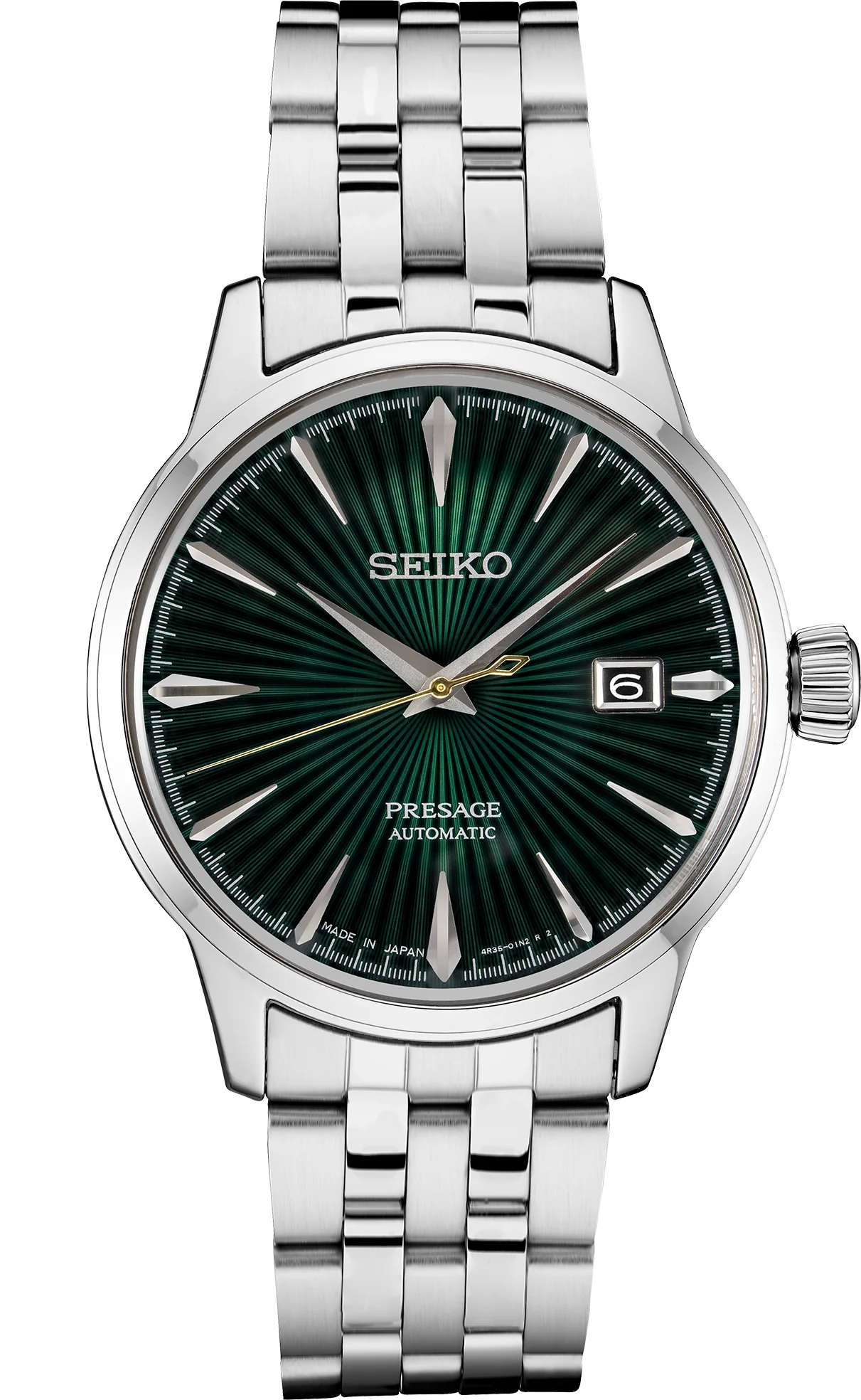 From the Presage Cocktail Time Collection.  SRPE15 Offering the finest in Japanese mechanical watchmaking, the Presage Collection blends precision technology with superior craftsmanship and design. Inspired by the delights of a cocktail bar, this sophisticated watch features a green dial with pressed pattern, gloss finish and date calendar. The 23-jewel movement, with manual and automatic winding capability, beats at a frequency of 21,600 vibrations per hour, with a power reserve of approximately 41 hours. Crafted of stainless steel, this elegant timepiece includes a box-shaped crystal, screwdown see-through caseback, and double deployment clasp with push button release. 5 bar, 50M Water Resistant