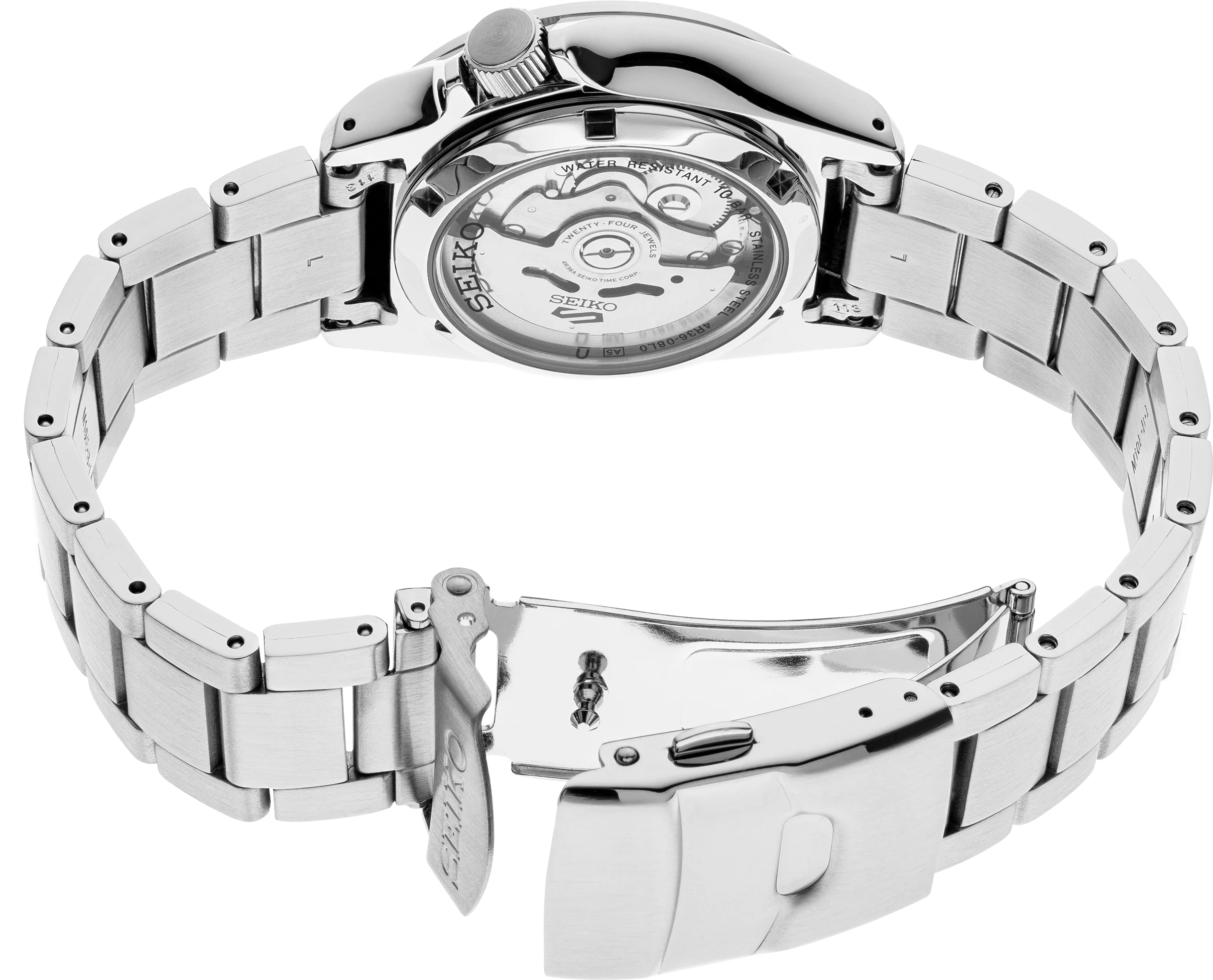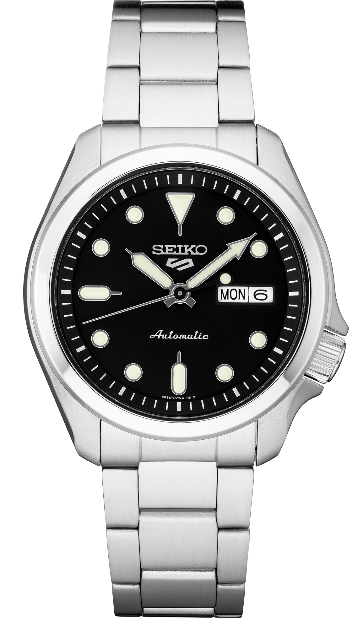 Show your style. Make your move. SRPE55 For over 50 years, Seiko 5 Sports has delivered consistently high levels of reliability, durability, and performance. For dependable timekeeping in your everyday life, this exceptional watch is powered by an automatic movement with a power reserve of approximately 41 hours and features a day/date calendar, LumiBrite hands and markers, and a see-through caseback. With a durable stainless steel case and bracelet and a black sunray dial, this versatile watch is 100 meter water resistant- perfect for your style no matter what your day has in store.