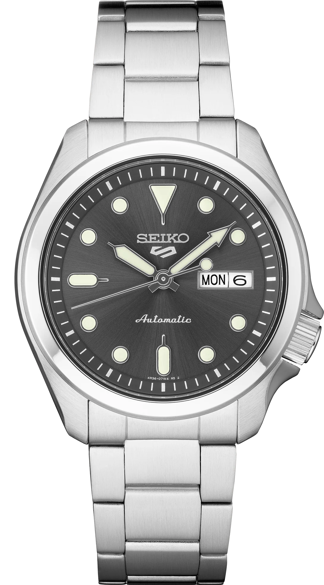 Show your style. Make your move. For over 50 years, Seiko 5 Sports has delivered consistently high levels of reliability, durability, and performance. SRPE57 For dependable timekeeping in your everyday life, this exceptional watch is powered by an automatic movement with a power reserve of approximately 41 hours and features a day/date calendar, LumiBrite hands and markers, and a see-through caseback. With a durable stainless steel case and bracelet and a gray sunray dial, this versatile watch is 100 meter water resistant- perfect for your style no matter what your day has in store.
