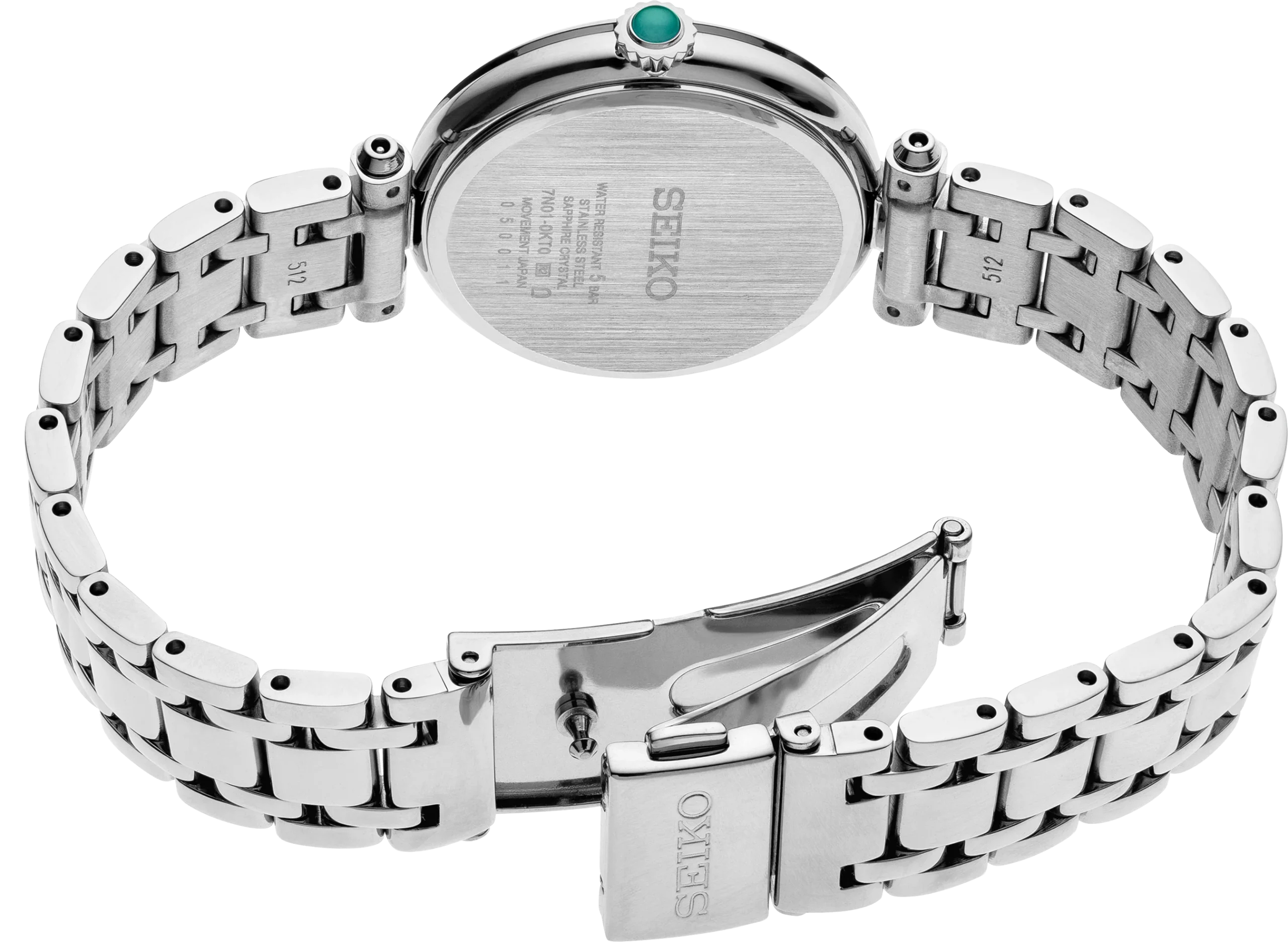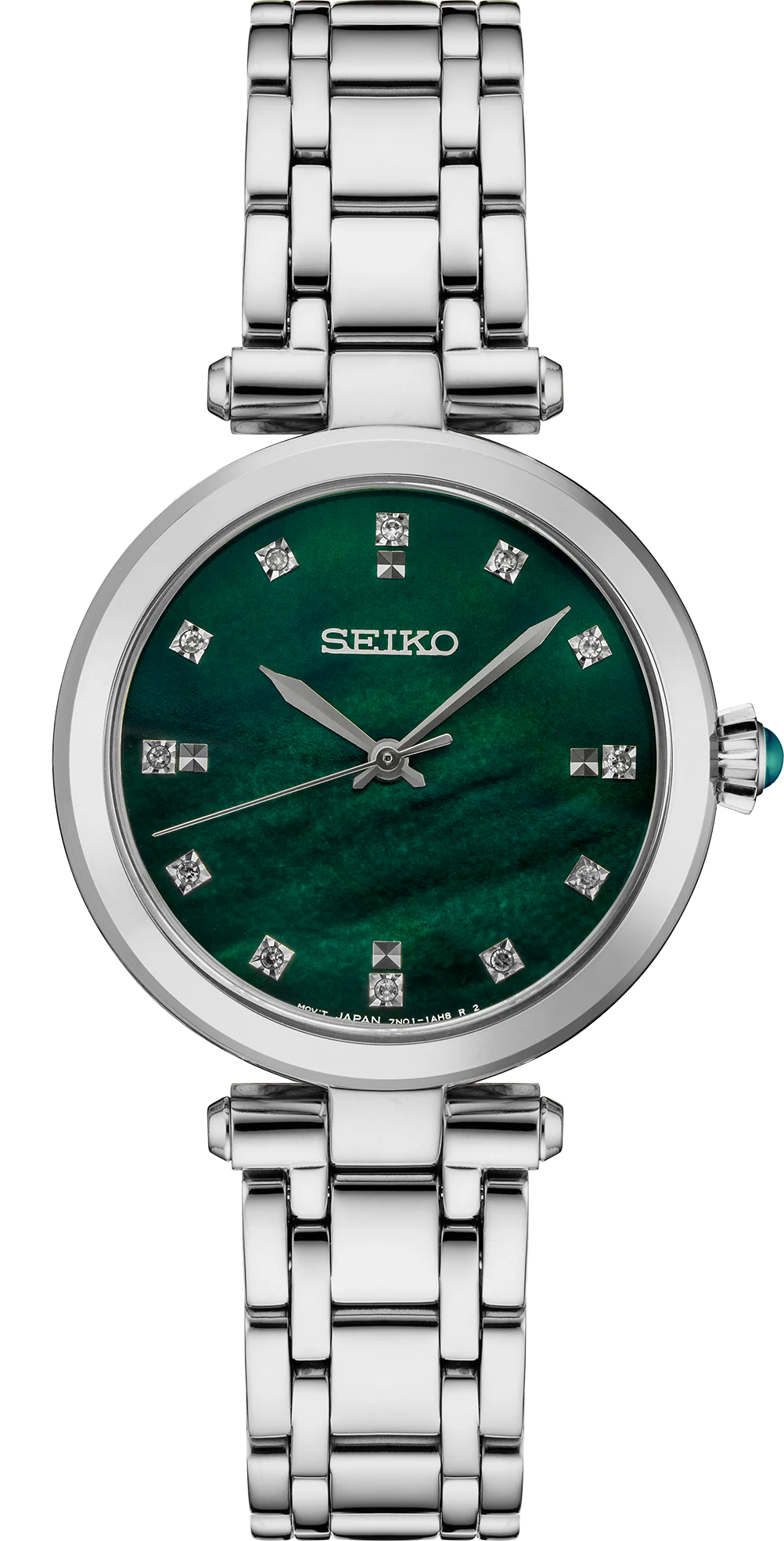 From the Diamond Collection. Designed to dazzle – the Diamond SRZ535  Collection provides the perfect dash of brilliance for any occasion. With an elegant jewelry-inspired look, this sophisticated design features a rich green mother-of-pearl dial set with 12 diamond markers. Crafted of stainless steel, with classic light blue cabochon crown, and a sapphire crystal for superior scratch resistance. 5 bar, 50M Water Resistant