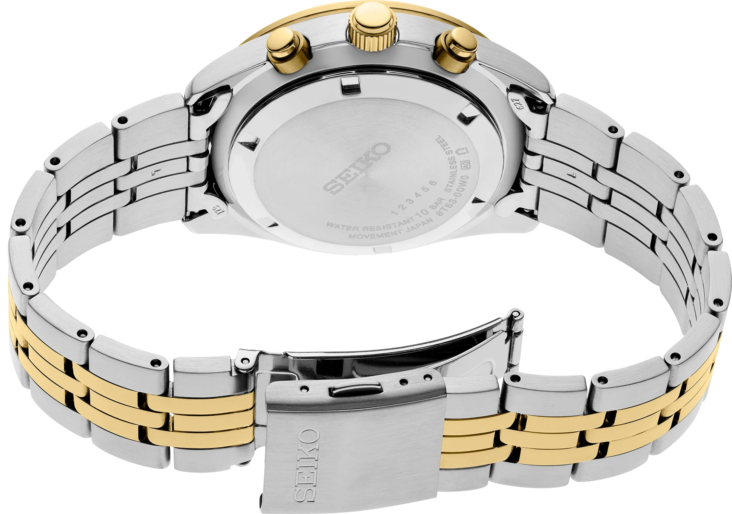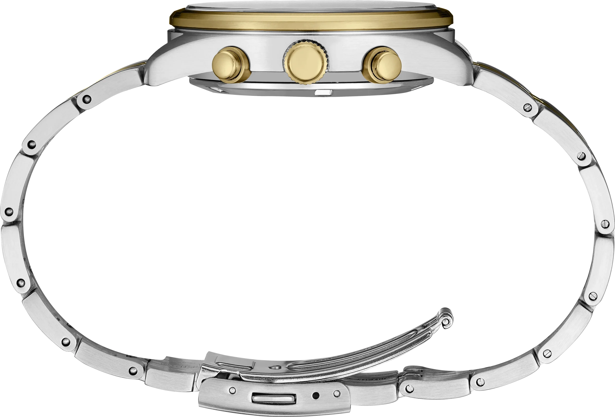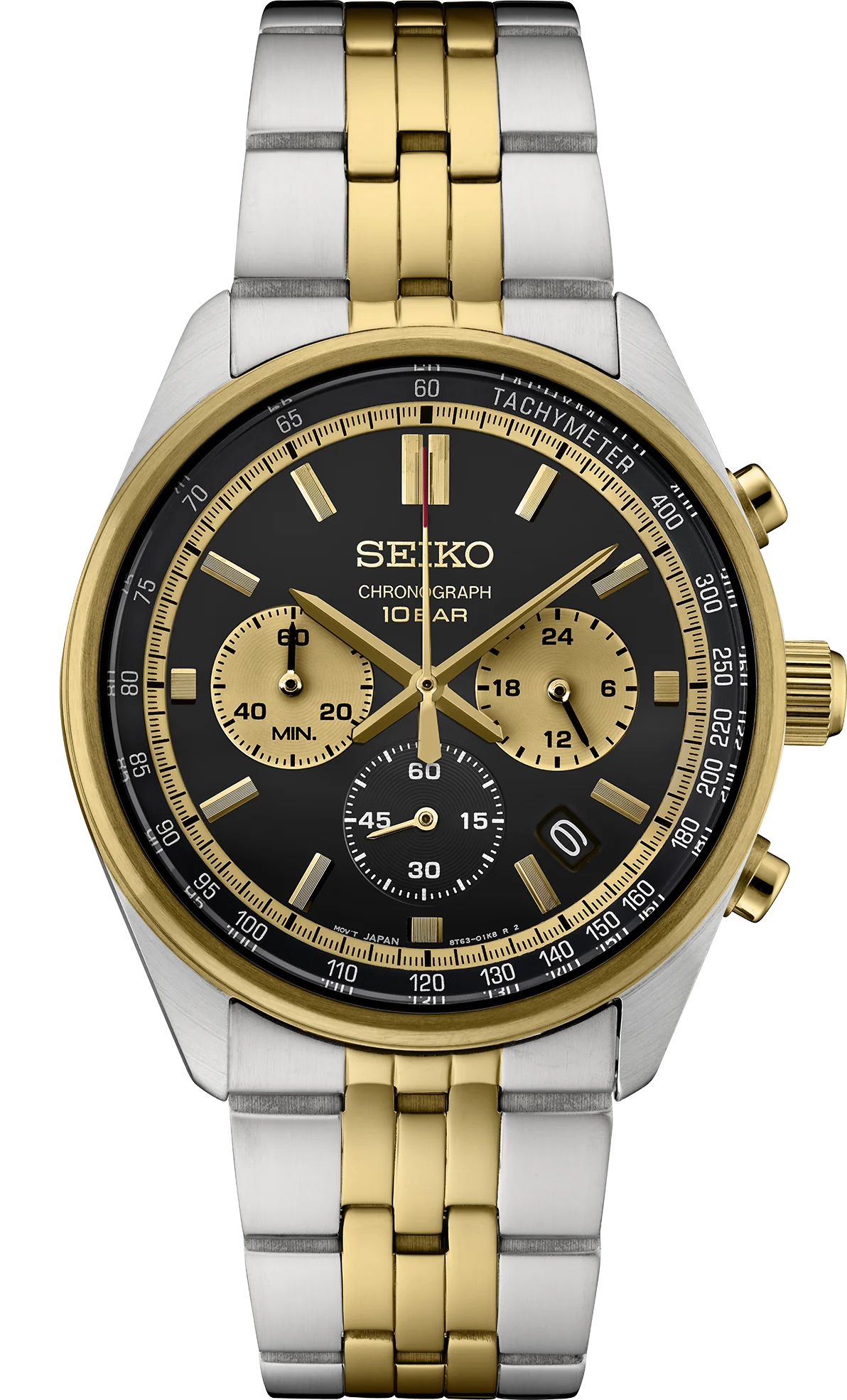 From the Essentials Collection. Inspired by motor sports, this dynamic chronograph  SSB430  features a black dial with bold, highly legible gold subdials at 3 and 9 o’clock styled to suggest a racecar instrument panel. Framed by a black tachymeter outer ring, the dial also offers a date calendar as well as a 24-hour subdial. The chronograph provides measurement of up to 60 minutes of elapsed time in 1/5-second increments. Crafted of stainless steel with mirror and hairline two-tone finish and tri-fold push button release clasp. 10 bar, 100M Water Resistant