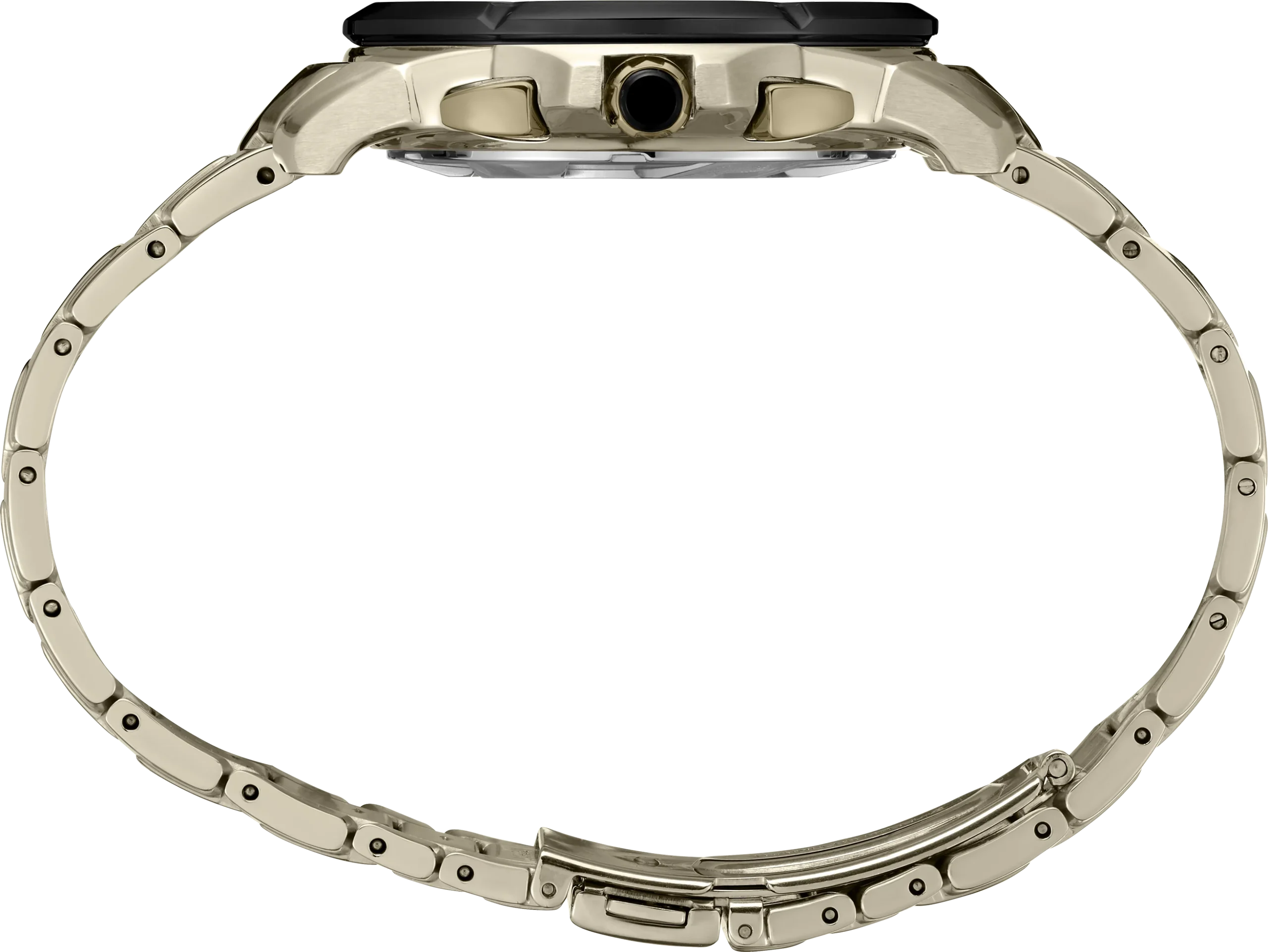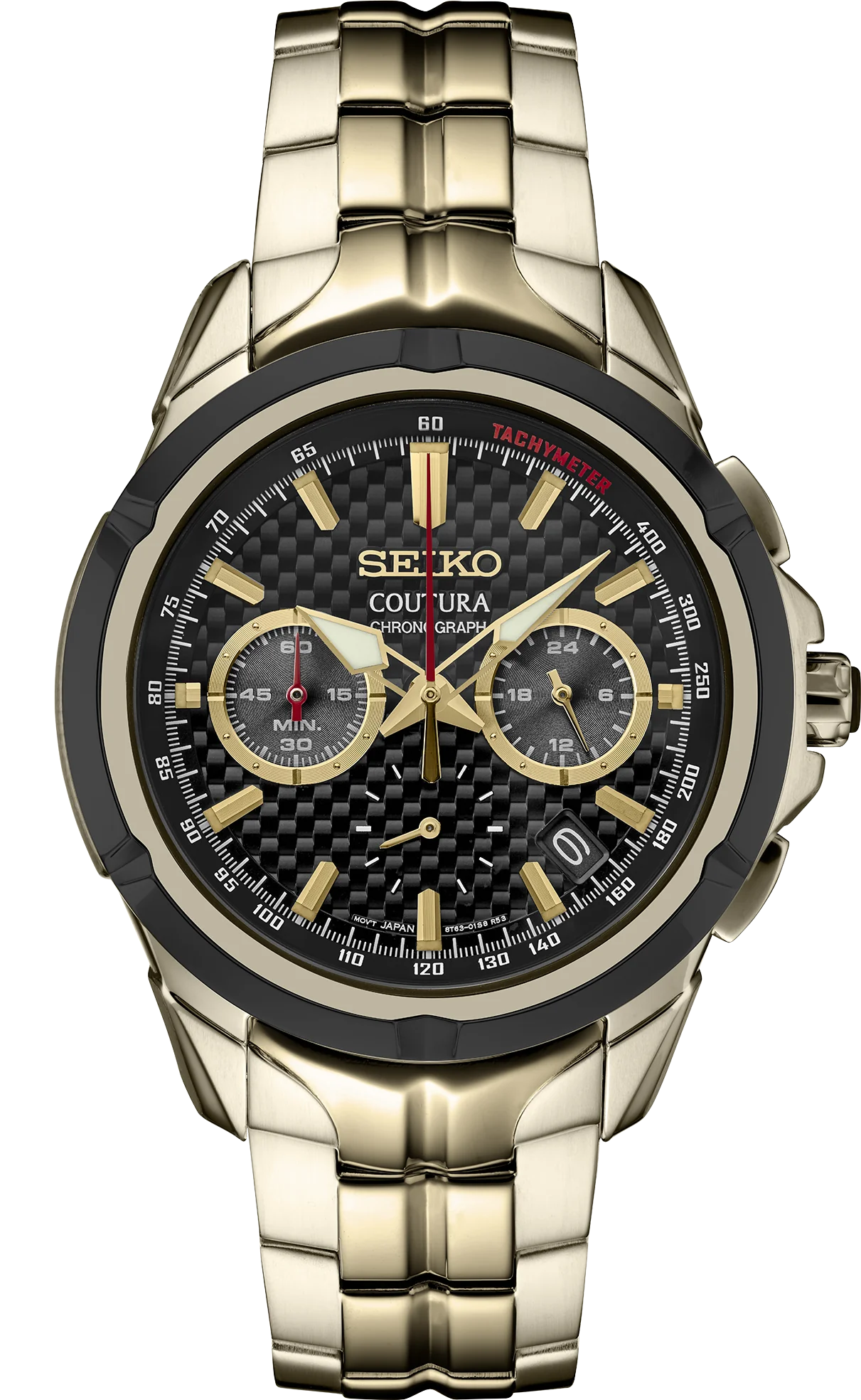 From the Coutura Collection. Delivering the perfect blend  SSB440 of technology and design for those on the move, the Coutura Collection combines bold angularity and shading with superior timekeeping for effortless sport/dress style. Inspired by motor sports, with a new case and bracelet design incorporating the angles and edges of racecar architecture, this dashingly sculpted chronograph features a multi-layer carbon-fiber patterned black dial with prominent 24-hour and chronograph minutes subdials at 3 and 9 o’clock styled to suggest a dashboard, tachymeter outer ring, date calendar, red chronograph hand, and LumiBrite hands and markers. Applied markers and subdial rings add a rich dimensionality, while the grooved black bezel provides a sense of propulsive action. Crafted of stainless steel in seiko watche  a light gold finish,  this dynamic watch includes a sapphire crystal, screwdown caseback, tri-fold push button release clasp and classic cabochon crown. The chronograph function offers timing to 60 minutes in 1/5-second increments with split time measurement. 10 bar, 100M Water Resistant