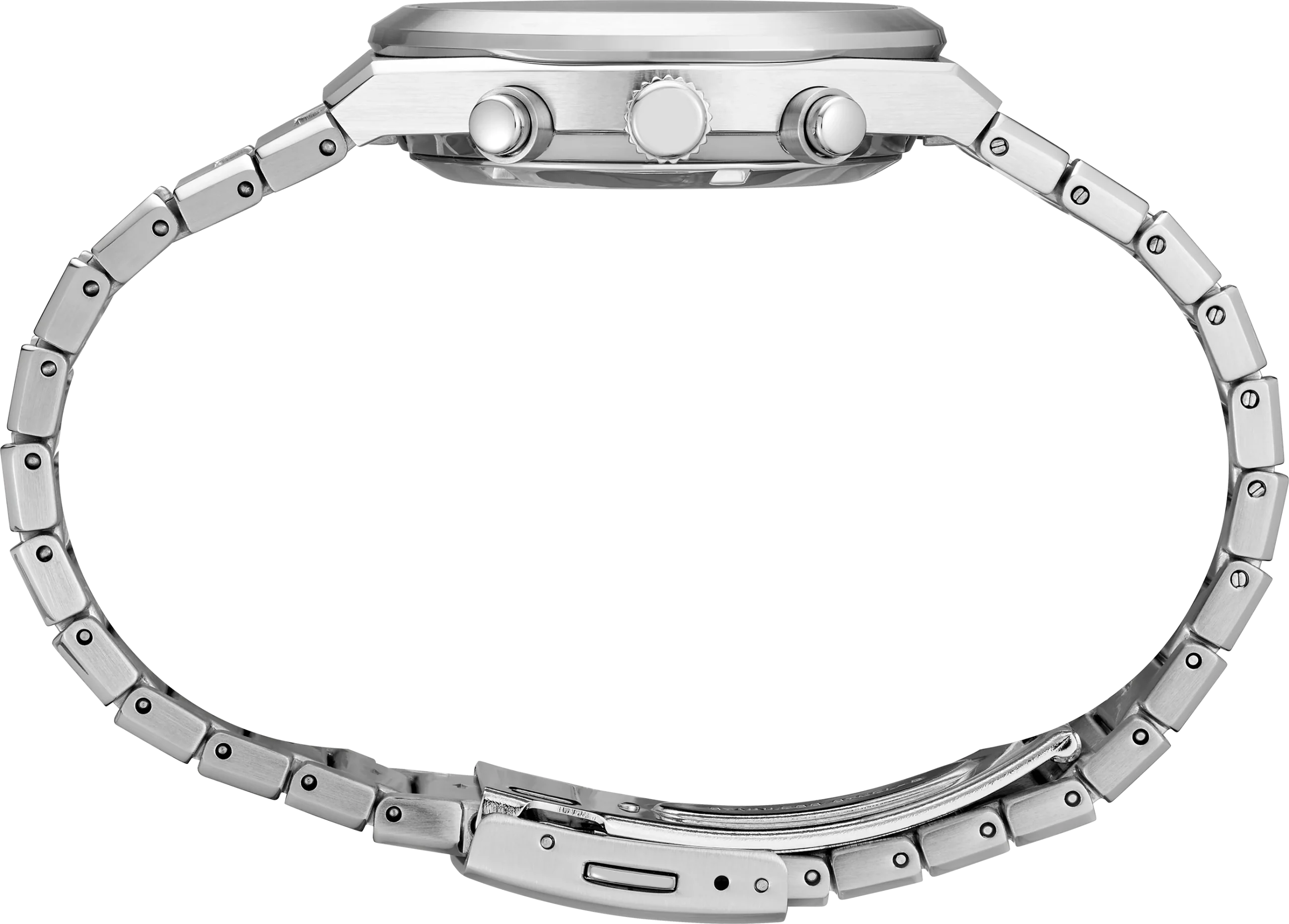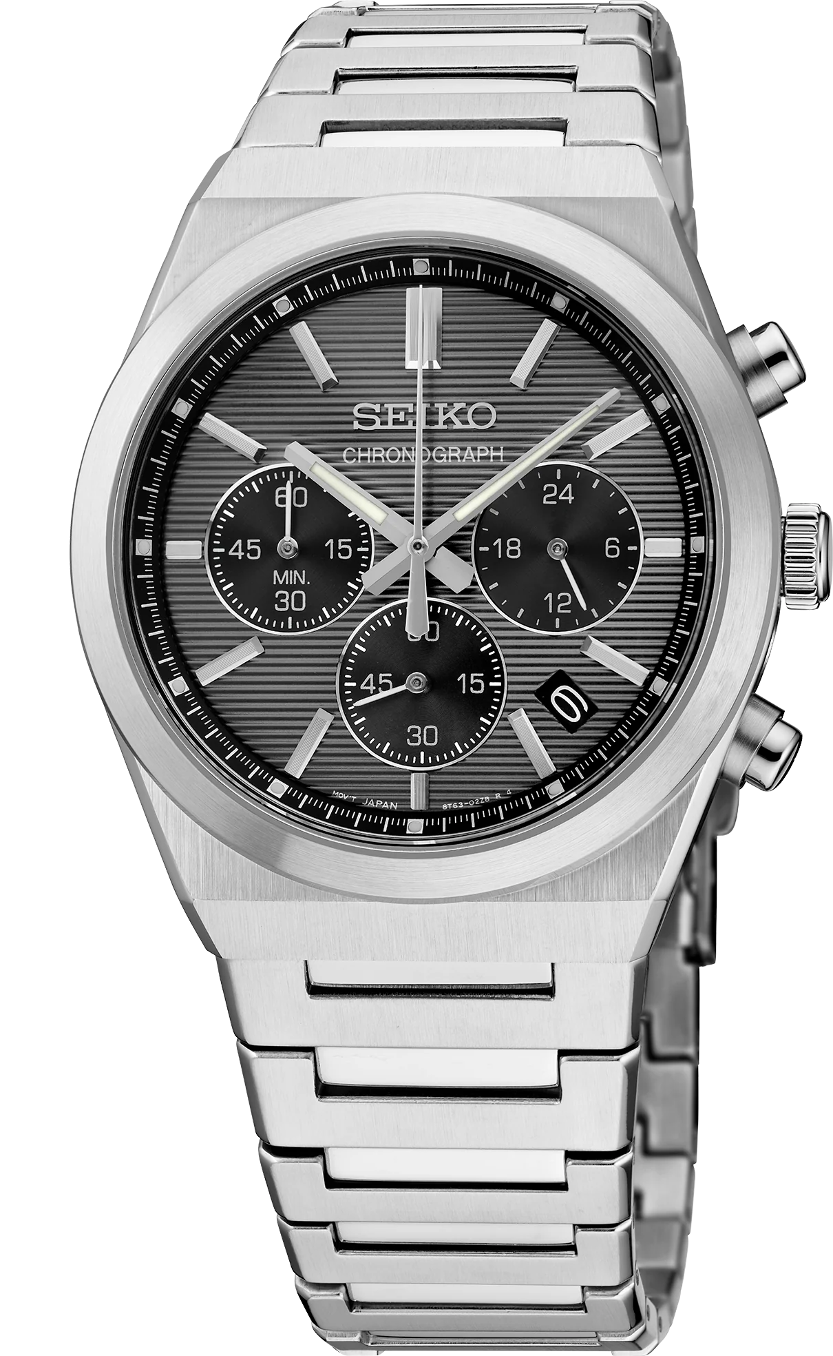 From the Essentials Collection. A modern take on a classic style, SSB455  this contemporary watch features a sleek, angular case and bracelet design perfect for both dress occasions and everyday wear. The gray pressed pattern dial showcases three subdials, simple stick indices, a date calendar, and LumiBrite hands and markers. Crafted of stainless steel with a scratch-resistant sapphire crystal, this versatile timepiece is equipped with a chronograph function that measures up to 60 minutes of elapsed time in 1/5 second increments and includes a secure screwdown caseback and tri-fold push button release clasp. 10 bar, 100M Water Resistant