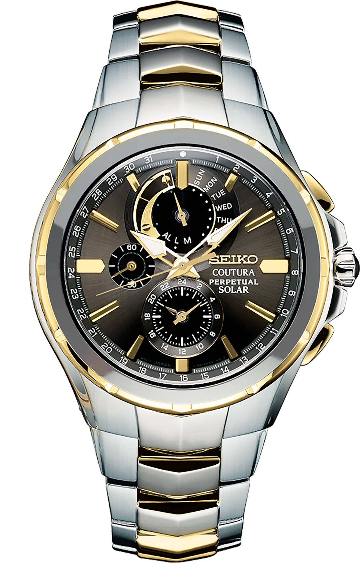 Coutura Solar Perpetual Chronograph. A stylish timepiece, the stunning SSC376  look of this watch is matched only by its precision performance. Designed with a stainless steel case and bracelet with gold accents. No battery change required and powered by light energy, using solar cells with high performance electricity generation. Energy-efficient Solar movement with 6 month power reserve once fully charged. The gray dial, protected with a sapphire crystal, features three subdials, luminous hands and markers, leap year, month, day and date indicator and power reserve indicator. Includes perpetual calendar that adjusts for odd and even months up to 2100. Chronograph measures up to 60 minutes in 1/5 second increments with split time measurement function. Cabochon crown. 100 meters water resistant.