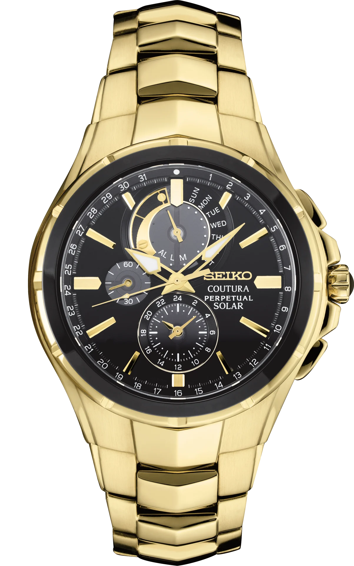 Coutura Perpetual Solar Alarm Chronograph. A sophisticated blend of design,  SSC700  precision and innovation, this distinctive watch provides effortless timekeeping excellence. Crafted in stainless steel with black dial, gold finish and markers, LumiBrite hands, sapphire crystal, screwdown caseback and cabochon crown, this boldly elegant timepiece features leap year, month, day and date indicators, with the perpetual calendar adjusting for odd and even months, including February of leap years, up to the year 2100. The chronograph function offers timing to 60 minutes in 1/5-second increments, with a split time measurement function. Powered by any light source, with no battery change required, the Solar Cell is energy-efficient, with a 6-month power reserve when fully charged and an on-dial power reserve indicator. 10 bar, 100M Water Resistant