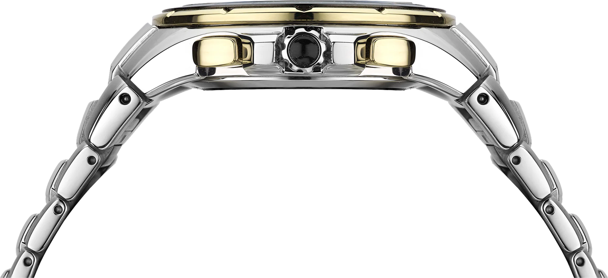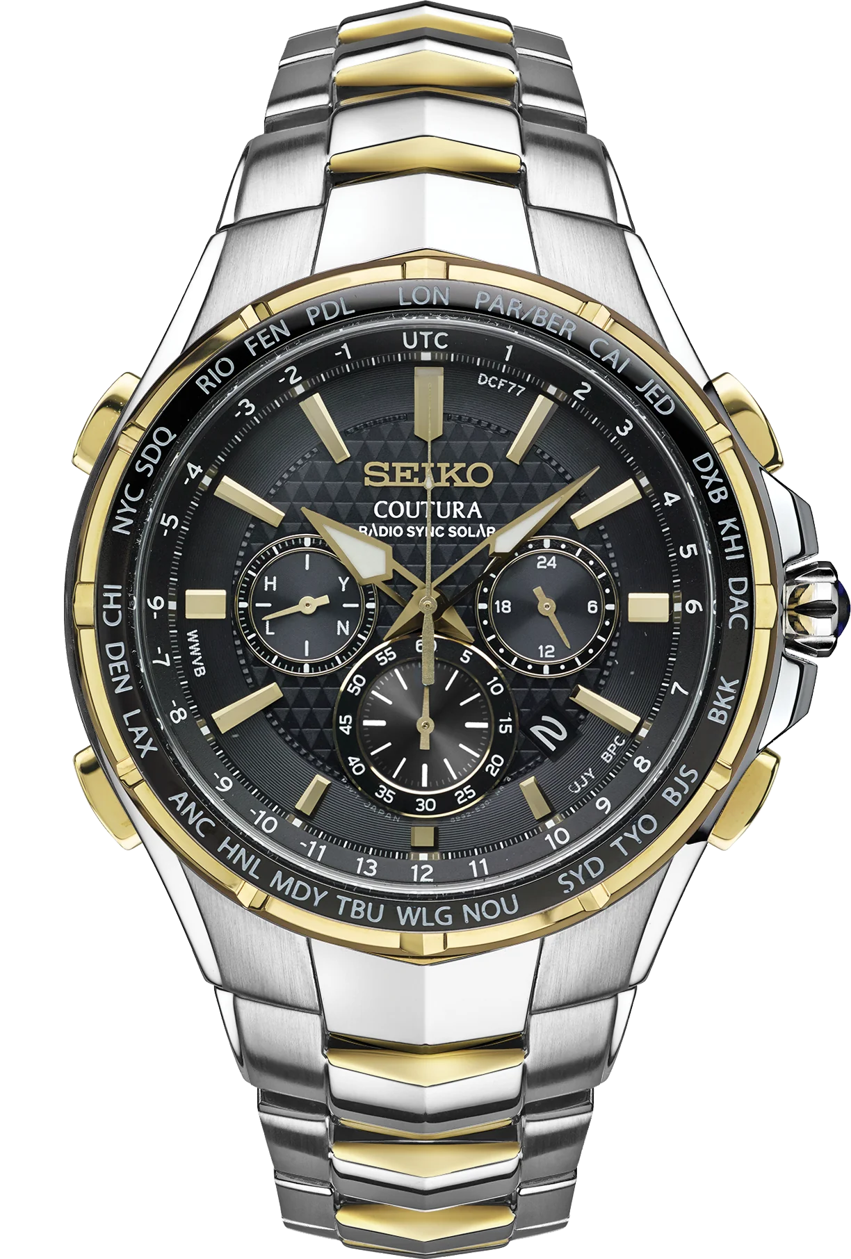 Seiko Coutura Radio Sync Solar Chronograph. This bold men’s SSG010  watch is designed with a two-tone stainless steel case and bracelet and a cabochon crown. The bold gray dial features lumiBrite hands and markers, a date calendar and three subdials with gold highlights. The gray bezel includes a world time function featuring 25 time zones. Radio-controlled, Radio Sync Solar Chronograph automatically receives radio signals to precisely adjust the time and calendar signal reception and result indicator. The chronograph measures up to 60 minutes in 1/5 second increments with a split time measurement function and a date calendar. Powered by any light energy, its Solar Cell is energy-efficient with a 6-month power reserve once fully charged. No battery change is required. 100M Water Resistant