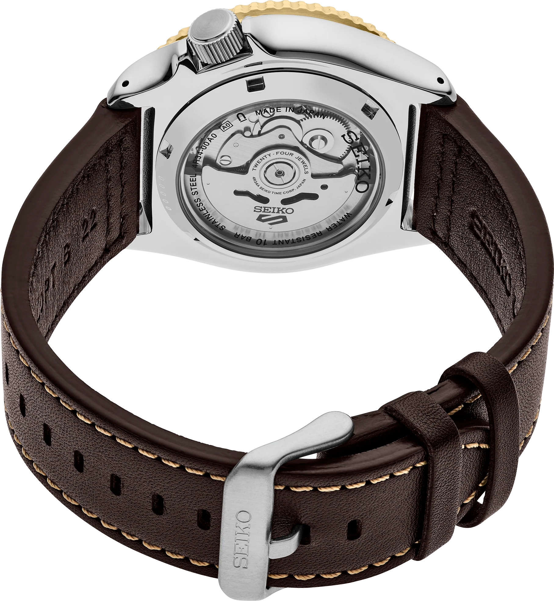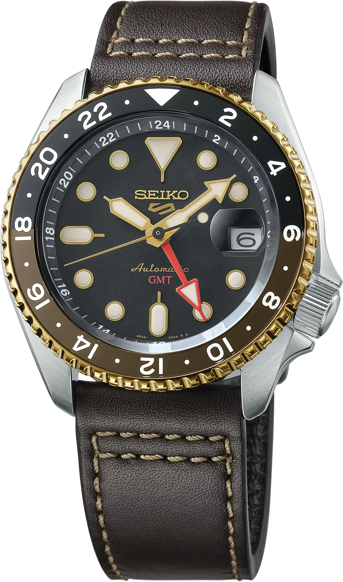 Seiko 5 Sports SKX Sports Style GMT Series. SSK036 Adding new richness to classic sport/dress design, this dynamic watch offers a new variation on the popular “SKX” style. Equipped with automatic technology that you control with every movement, this versatile watch is powered by a 24-jewel movement that beats at a frequency of 21,600 vibrations per hour, with a power reserve of approximately 41 hours and manual winding capability. The black dial features bold luminous hands and markers and a magnified date calendar, as well as a large red GMT hand for instant visibility and is framed by a sleek gold, black, and dark brown GMT bezel. A brown leather strap, with contrast stitching, the first in the series, adds rich texture and wearability, while the stainless steel case includes a screwdown see-through caseback for a view of classic timekeeping in action. 10 bar, 100M Water Resistant