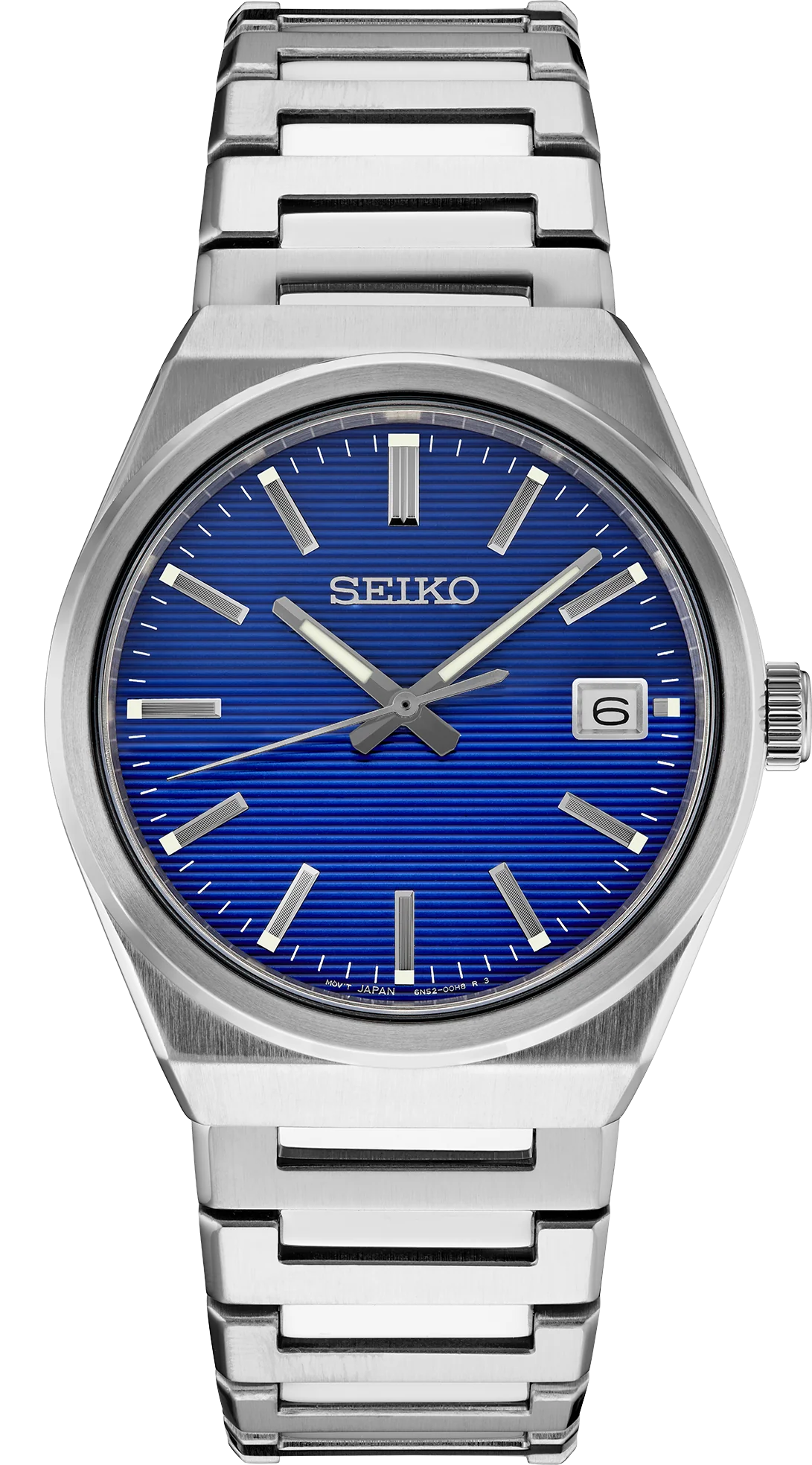 From the Essentials Collection. An updated classic, this sleekly SUR555  angled watch features a vibrant blue pressed-pattern dial with simple stick indices, date calendar, and LumiBrite hands and markers. Crafted of stainless steel with a scratch-resistant sapphire crystal, this versatile timepiece includes a secure screwdown caseback and tri-fold push button release clasp. 10 bar, 100M Water Resistant