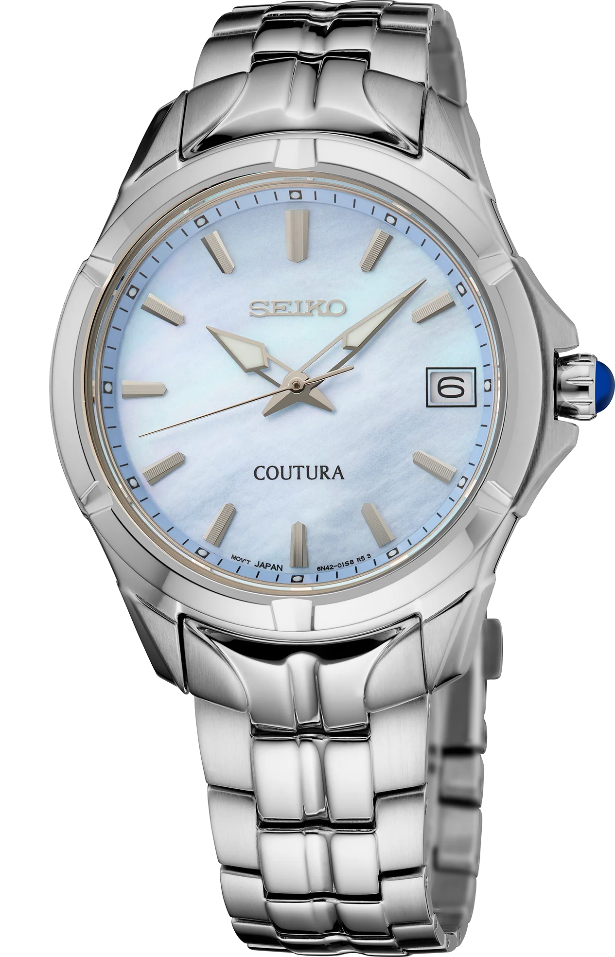 From the Coutura Collection. Expressing a polished and modern sophistication, SUR583  the Coutura Collection combines bold angularity and elegant design with superior timekeeping for an effortless sport/dress aesthetic. This versatile timepiece, perfect for day-to-night style, features a shimmering pale blue mother-of-pearl dial with silver applied indices, adding a rich 3-dimensional appearance to the elegant look. Crafted of stainless steel, with a perfectly proportioned case and bracelet for a streamlined fit, this graceful watch is topped with a scratch-resistant sapphire crystal and includes LumiBrite hands and markers, a date calendar, a classic cabochon crown, and a tri-fold push-button release clasp. 10 bar, 100M Water Resistant