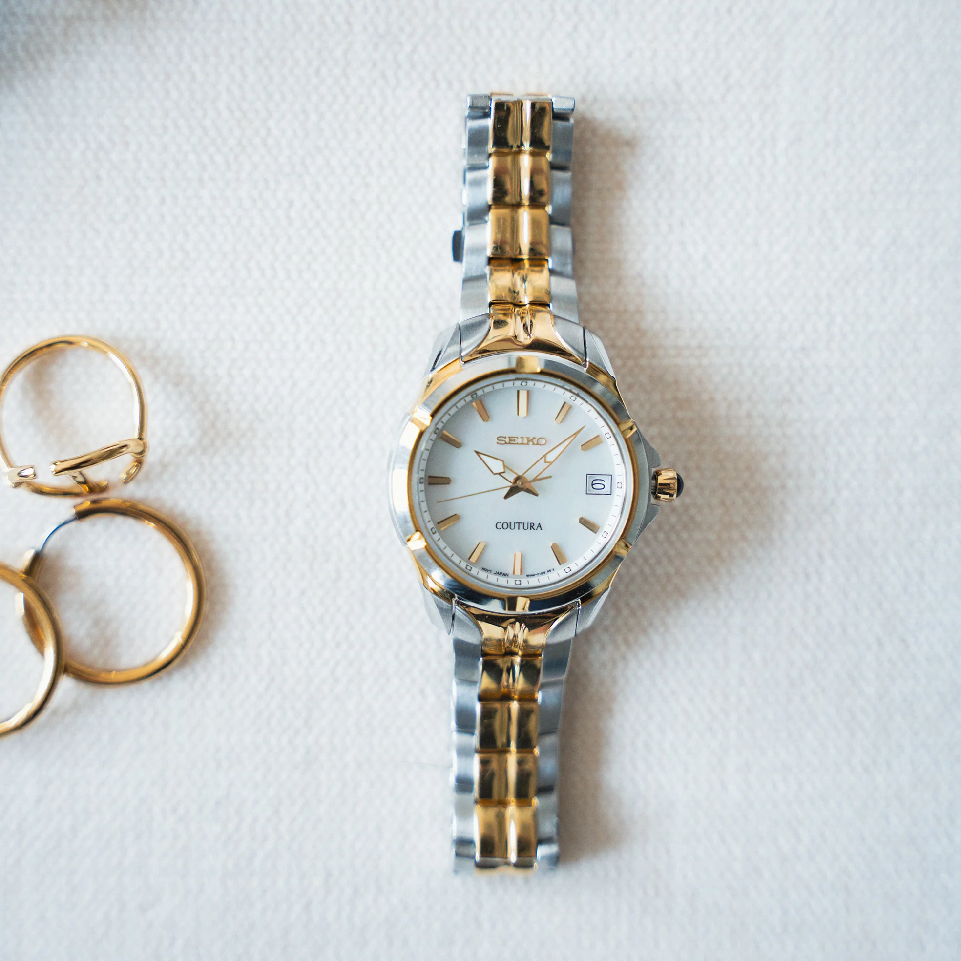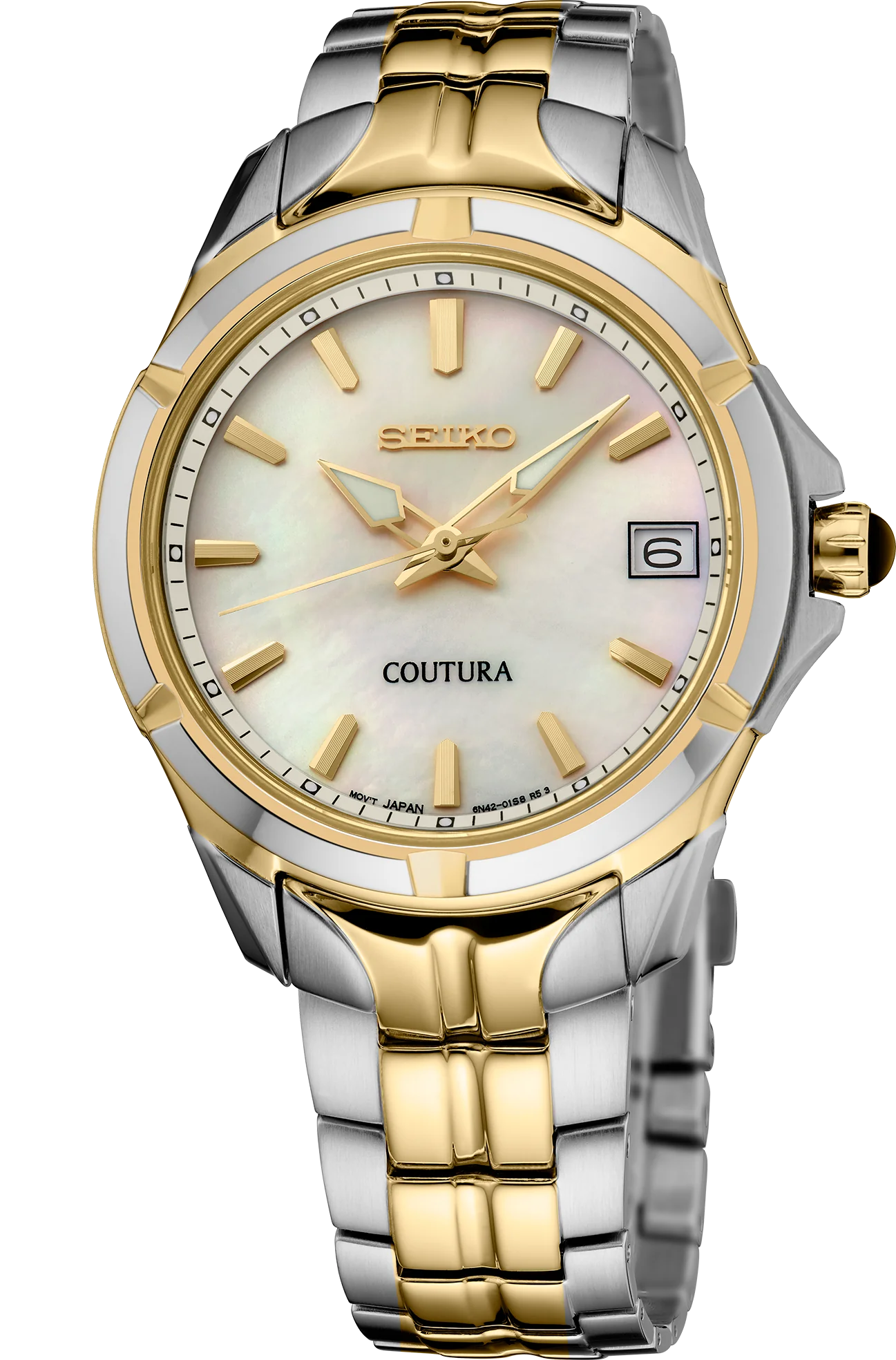 From the Coutura Collection. Expressing a polished and modern sophistication, SUR586  the Coutura Collection combines bold angularity and elegant design with superior timekeeping for an effortless sport/dress aesthetic. This versatile timepiece, perfect for day-to-night style, features a classic white mother-of-pearl dial with gold applied indices, adding a rich 3-dimensional appearance to the elegant look. Crafted of stainless steel, with a perfectly proportioned case and bracelet for a streamlined fit, this graceful watch is topped with a scratch-resistant sapphire crystal and includes LumiBrite hands and markers, a date calendar, a classic cabochon crown, and a tri-fold push-button release clasp. 10 bar, 100M Water Resistant