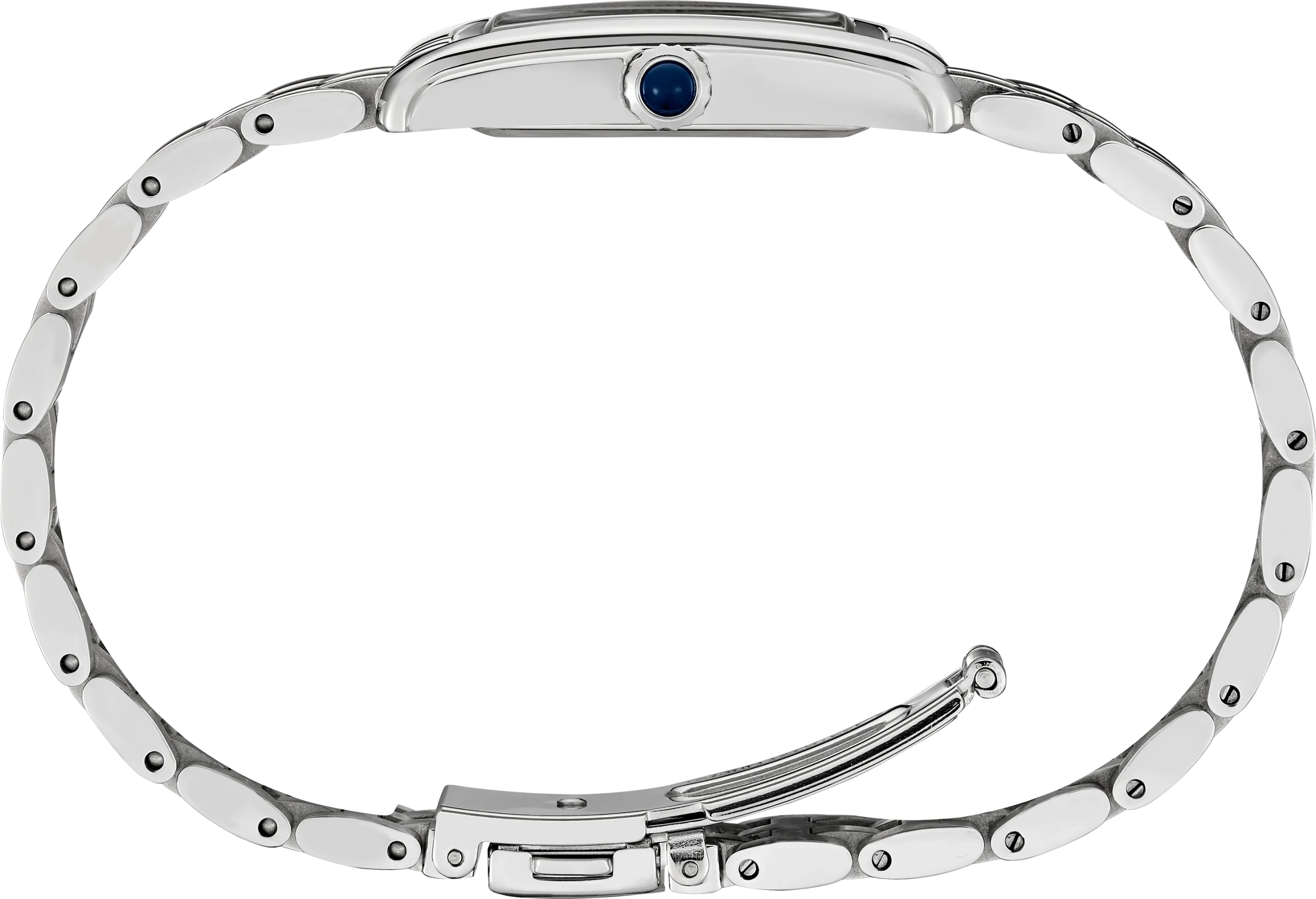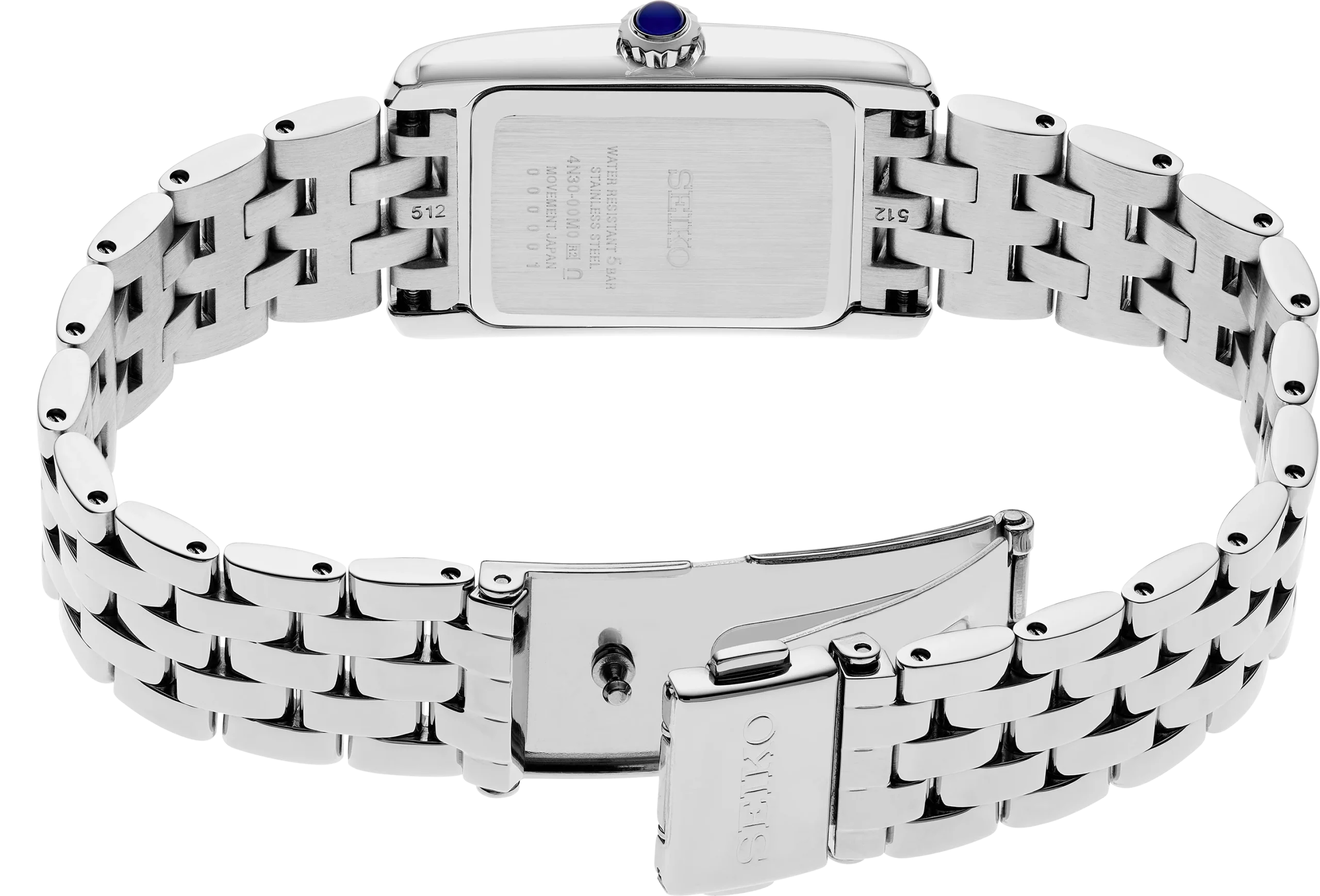 From the Essentials Collection. A sophisticated classic, SWR083  perfectly proportioned for a jewelry-like feel, this elegant rectangular case watch offers a patterned white Roman numeral dial, blue hands and a blue cabochon crown. Crafted of stainless steel, this graceful design includes a five-row stainless steel bracelet for sleek wearing comfort, and a tri-fold push button release clasp. 5 bar, 50m Water Resistant